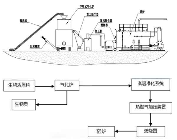 生物质原料通过螺旋加料机加入气化炉,而气化所需要的空气通过鼓风机从气化炉底部的配风装置进入气化炉内,生物质原料在缺氧状态下燃烧生成可燃气体和焦油,部分焦油在高温下发生二次裂解为不凝性可燃气体。热分解析出的焦碳与燃烧产生的水蒸汽和二氧化碳进行还原反应,产生氢气、一氧化碳等可燃气体,在气体上升过程中,继续进行还原和热解反应。气态焦油、气体连同灰渣颗粒、焦碳从气化炉上部流出,进入随后的燃气净化分离装置旋风除尘器,进入旋风除尘器绝大部分灰渣通过旋风除尘器从燃气中分离出来。灰渣通过除灰装置、灰输送装置输送到合适的地点。旋风除尘器分离出来的燃气进入燃气加压装置,被压送到锅炉燃烧机完全燃烧。